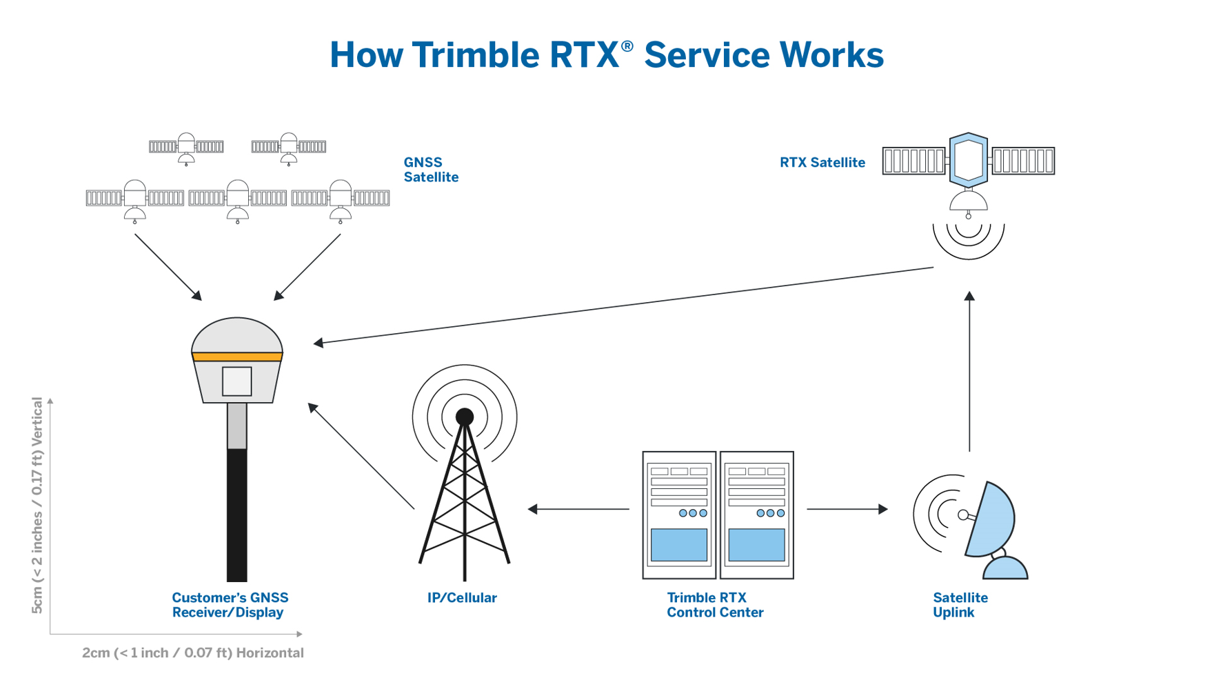 Trimble has a worldwide network of reference stations that are continuously tracking all GNSS constellations. Corrections are calculated for precise satellite clocks and orbits, along with global and regional atmospheric models. This information is sent to a satellite uplink and then to a set of geostationary satellites in orbit around the globe; the geostationary satellites broadcast the Trimble RTX correction via the L-band frequency. Your Trimble GNSS rover is always tracking the standard GNSS satellites, and is also tracking the geostationary RTX satellite. Your rover is able to use the CenterPoint RTX correction directly from the geostationary satellite to calculate high-accuracy positions; there is no additional equipment required, however, you are able to receive the same correction stream via the Internet, if desired.
