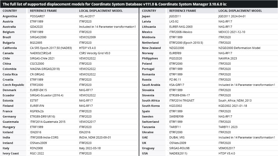 The full list of supported displacement models for Coordinate System Database v111.0 & Coordinate System Manager 3.10.6.0 is: