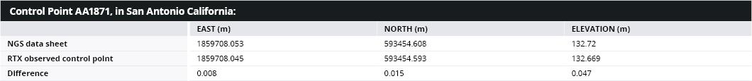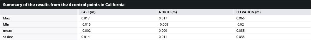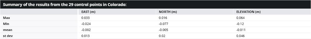 Four National Geodetic Survey (NGS) control points were selected in California and 29 in Colorado. All control points were measured using CenterPoint RTX with a Trimble R12 and Trimble Access 2020.20. The Grid coordinates reported by Trimble Access and Trimble Business Center were compared to the official State Plane coordinates from the NGS data sheets.