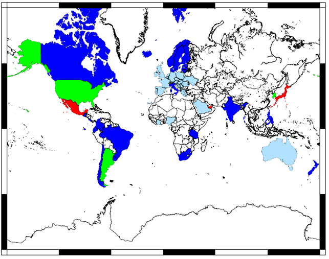 Countries in green use a full displacement mode including a velocity model and earthquake grids, and countries in red provide an online calculator, which we implement as a distortion grid.