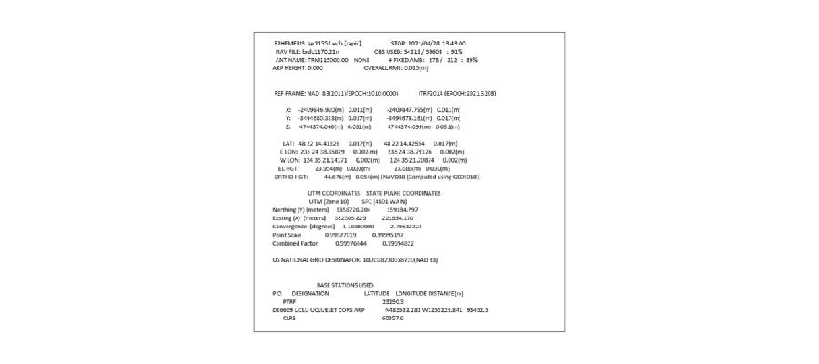 A sample data report from an automated online post-processing service (NGS OPUS), from submitted long-static observations. Note that you may be able to meet the same accuracy estimates (shown) with much shorter observation times using real-time correction services.