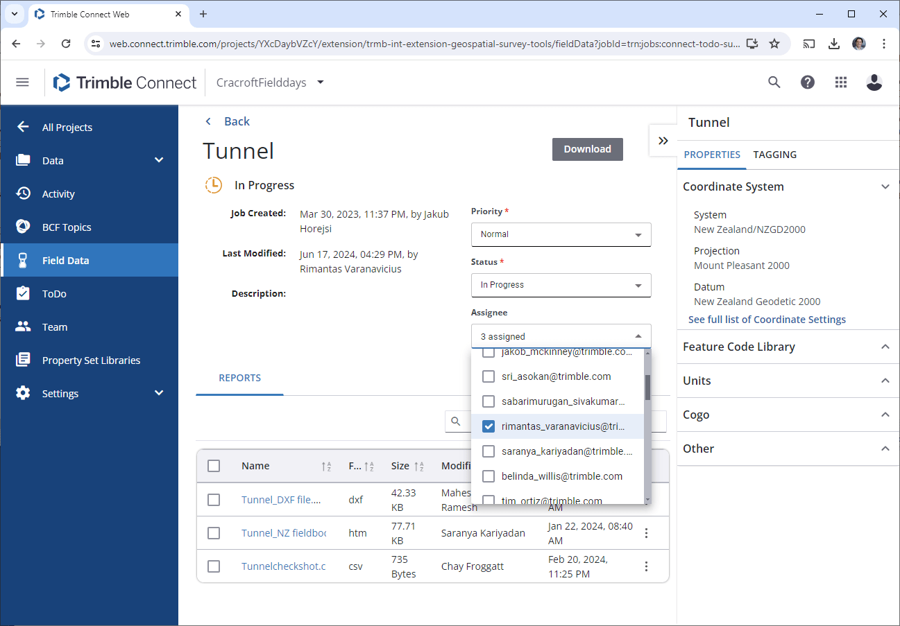 Once field data meets quality standards, assigning it to other users for processing in Trimble Business Center office software (TBC) or other design applications is straightforward. The TBC Connected Workspace feature allows direct access to cloud-stored data. For those utilizing third-party applications, downloading the necessary field data through Trimble Connect is simple.