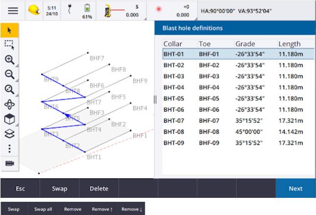 The blast hole definitions list now appears alongside the map. This enhancement allows surveyors to see selected points directly on the map and provides a clear visual representation of their work. Any changes made to the list, their order or blast hole direction are immediately reflected on the map. This helps surveyors quickly visualize the impact of their adjustments and improve overall accuracy.