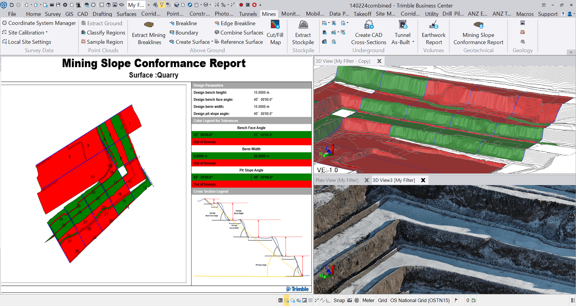 Mine surveyors play a key role in ensuring an open-pit operation's slopes are healthy and per design. Using TBC mining, you can create a slope conformance report that will produce a heat map and report on whether different slope regions are in or out of tolerance according to design parameters. This report can be given to mine stakeholders to then be used for repair, clean up or identify areas of improvement: